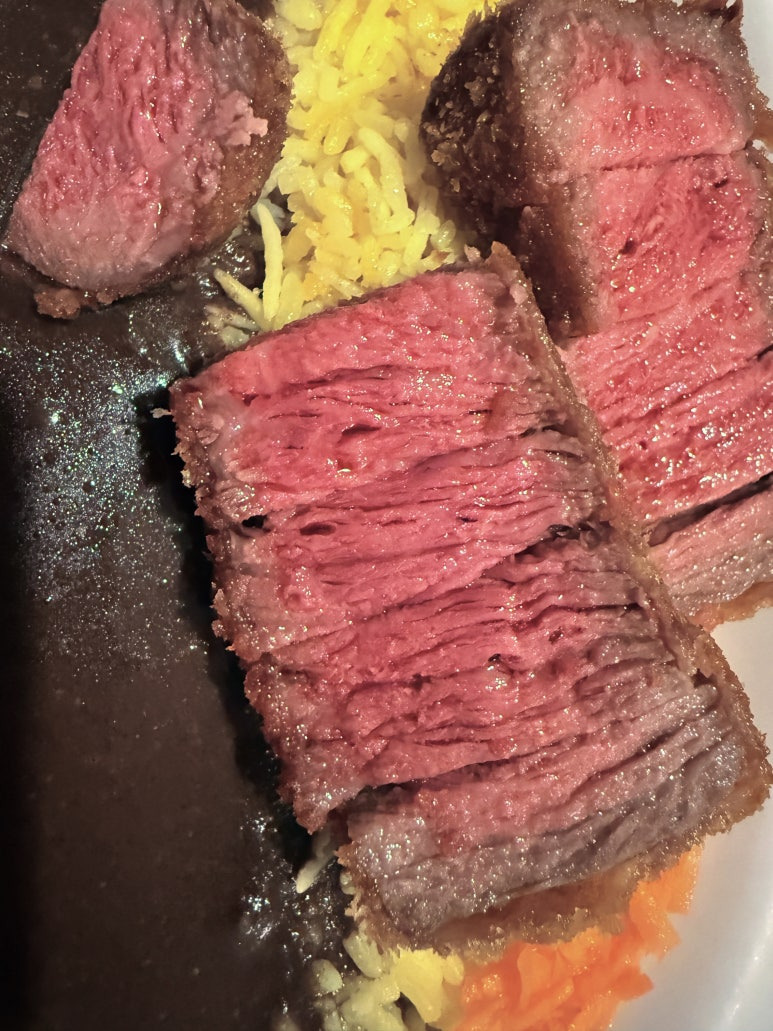 겉은 살짝 익히고 속은 부드러운 미디엄 레어 느낌으로, 고기 식감과 카레의 조합이 좋았습니다.