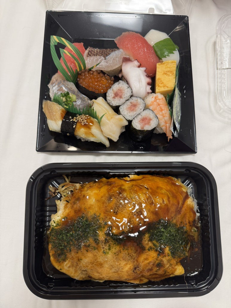 백화점 식품관에서 오코노미야키와 초밥을 사 와 편안한 마무리를 했습니다.